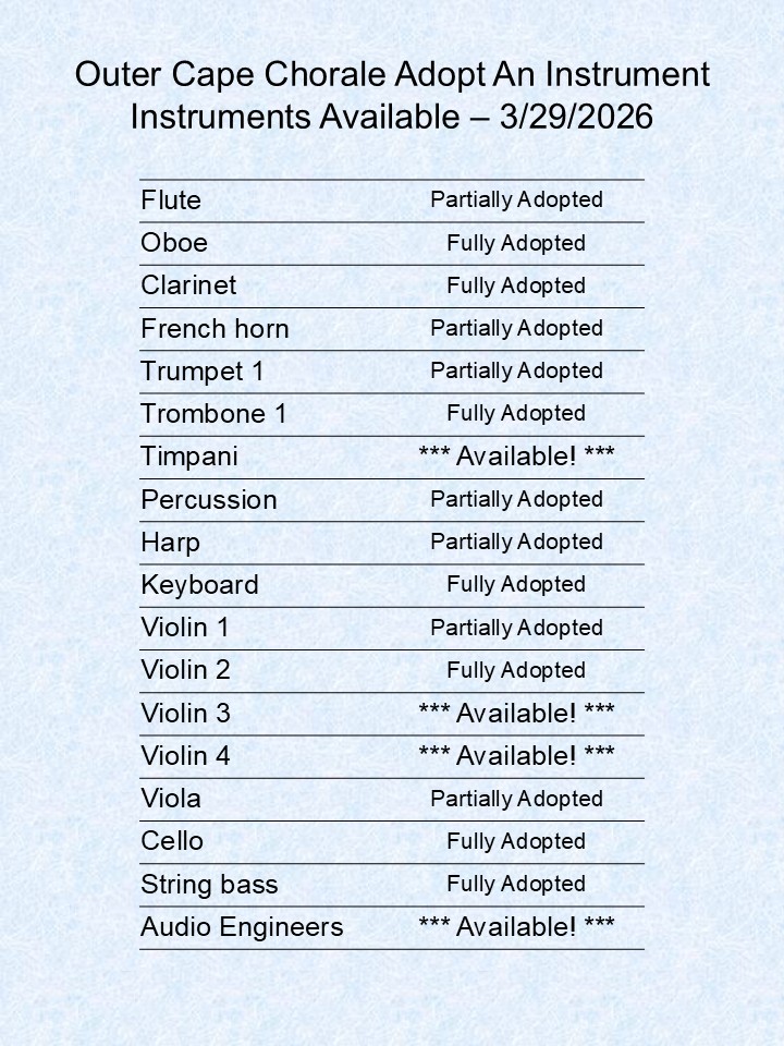 Please consider participating in the Outer Cape Chorale’s “Adopt An Instrument” fundraising program for Spring 2026! You can “adopt” an instrument from the chamber orchestra and be recognized at our May 2026 concerts, “Voices of Hope!”.